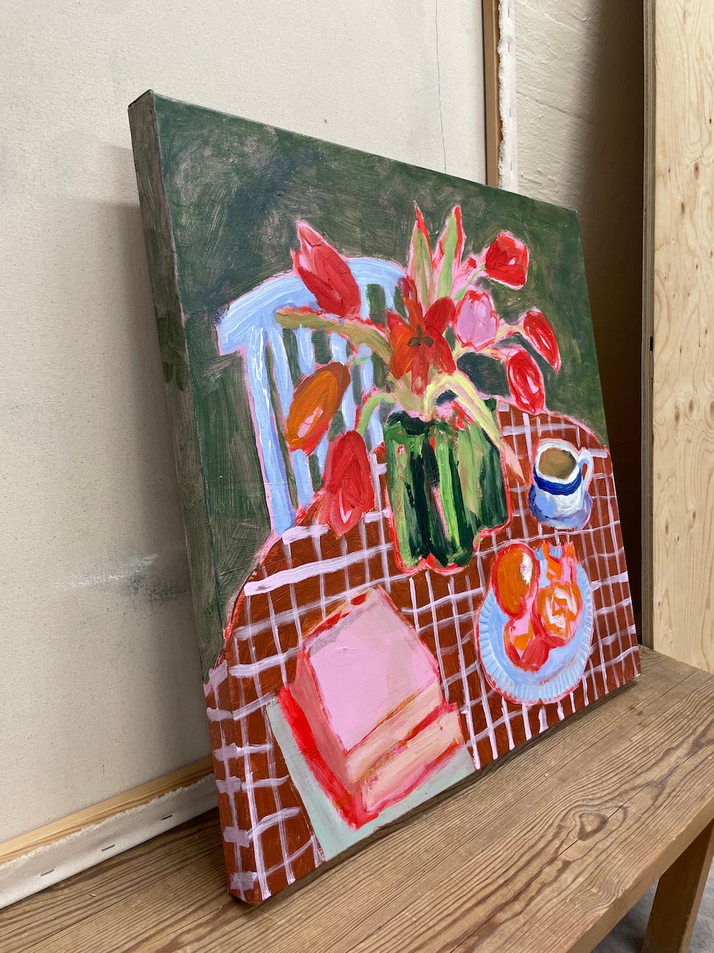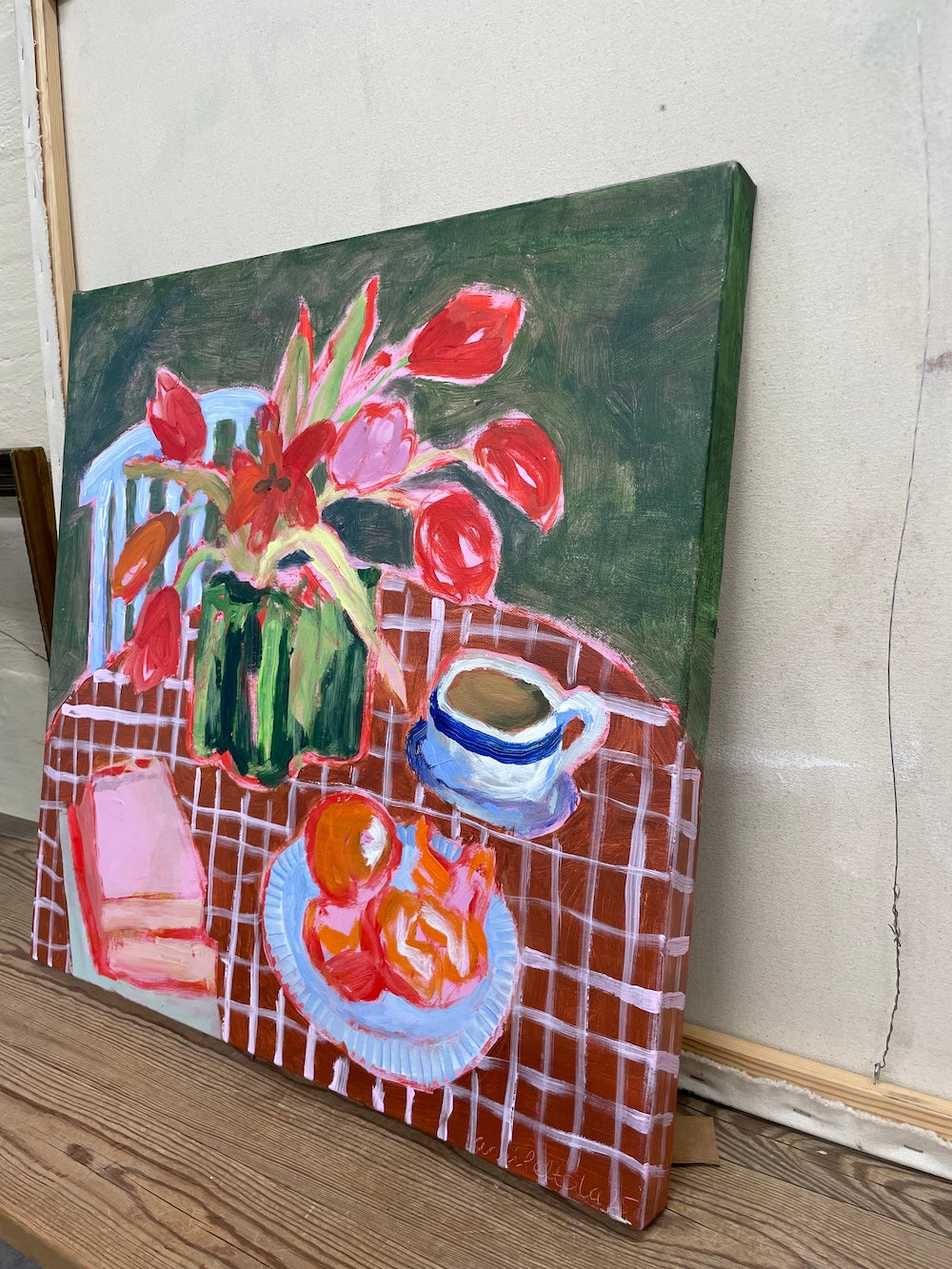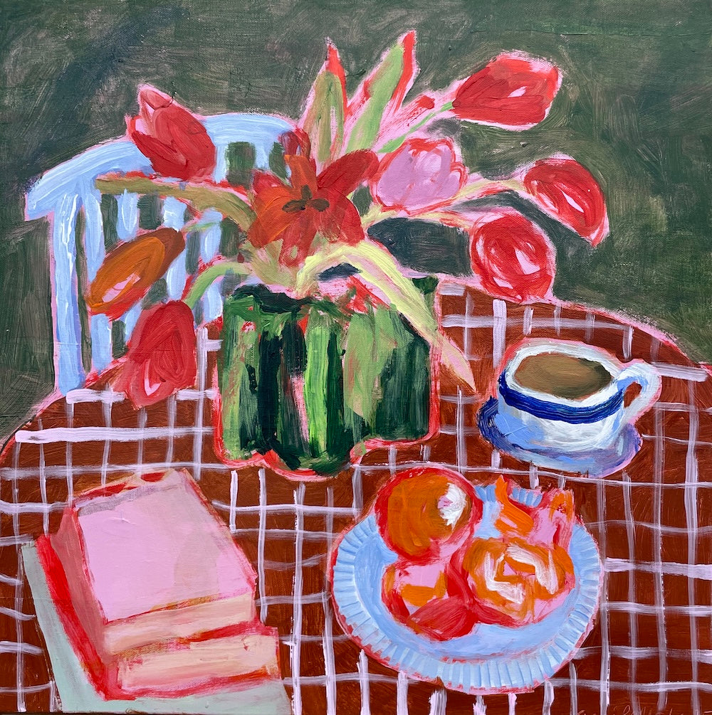 Maalauksessa on pysähtynyt tunnelma. Pöytään on katettu kahvia ja hedelmiä sekä pino keskeneräisiä kirjoja. Teokseni on muistutus tietoisesta pysähtymisestä arjen keskellä. Päivittäin voi viettää pienen hiljaisen lukupiirin kauniin kattauksen äärellä tai tehdä jotain muuta itselle merkityksellistä. Omaan arkeen voi tuoda virikkeitä ja inspiraatiota. Elämä tapahtuu arkisissa hetkissä, eikä sitä tarvitse säästellä juhlaan.