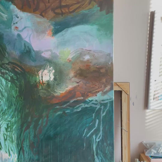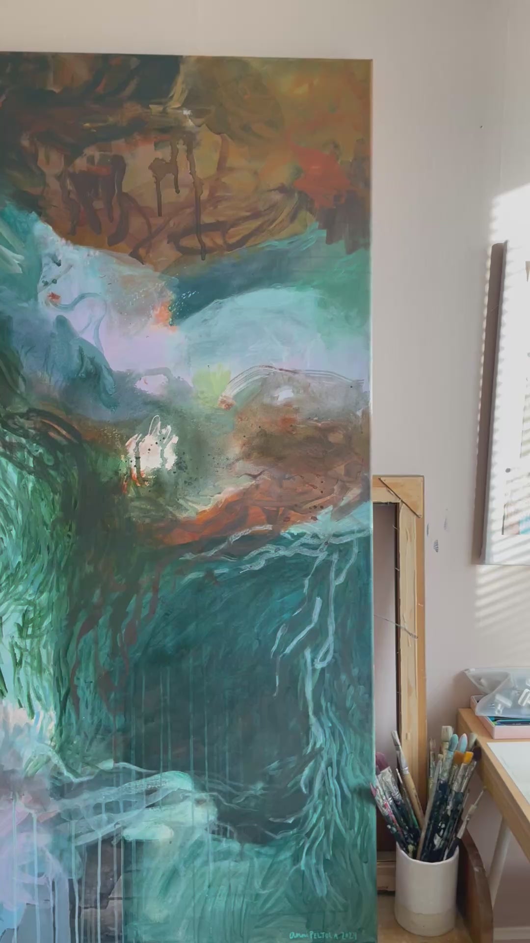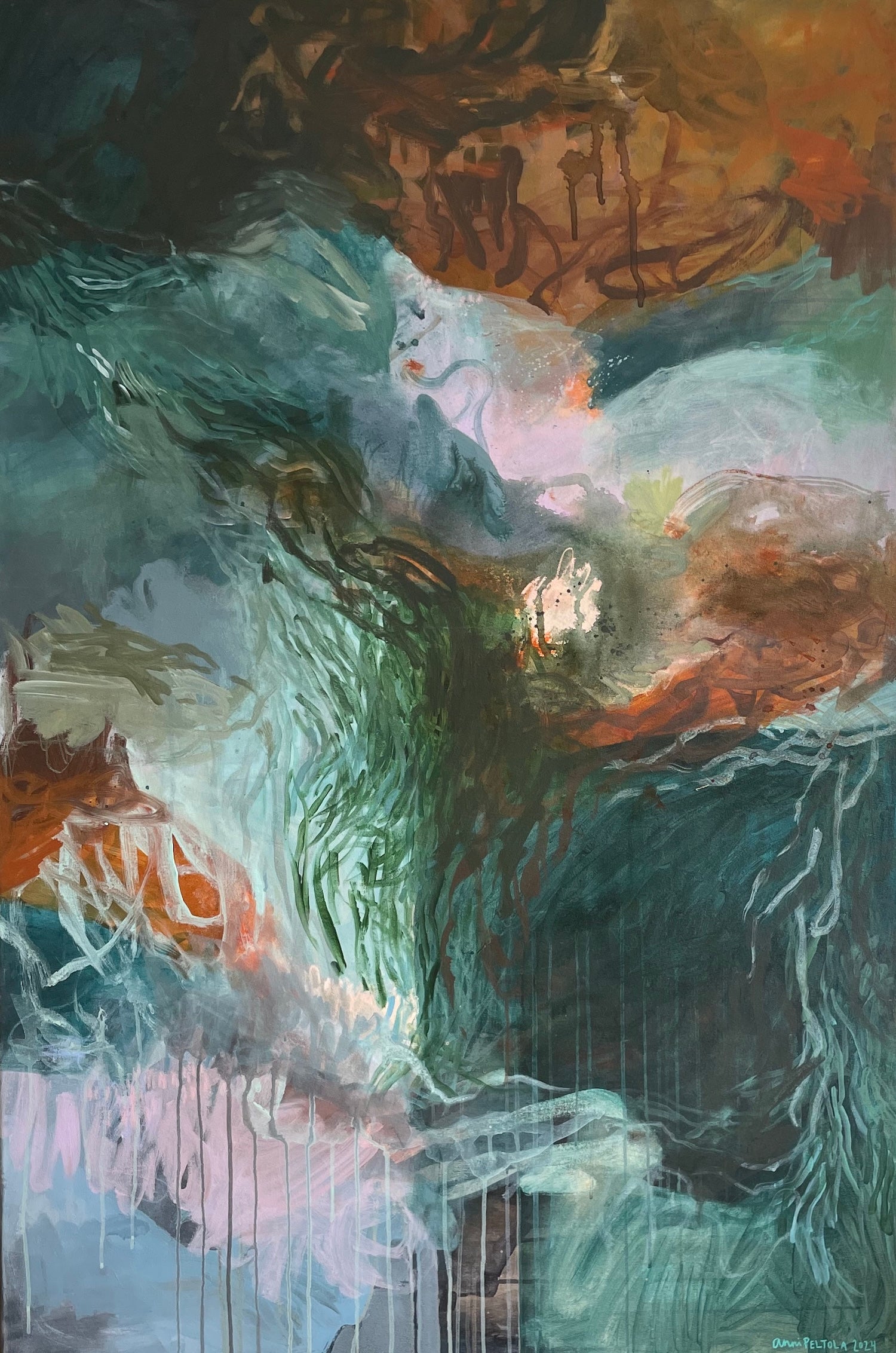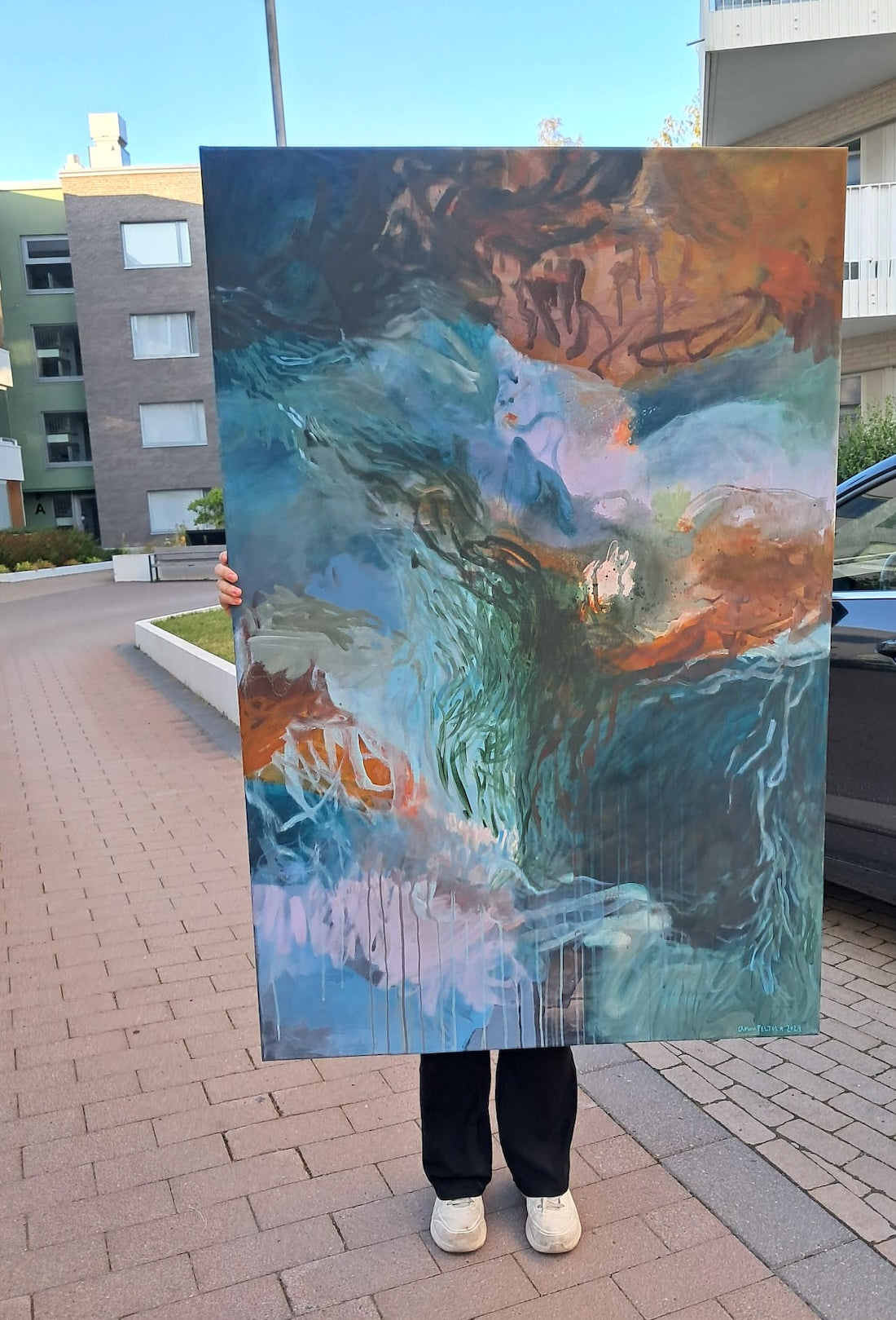 Teos on hakenut inspiraatiota ja liikekieltä merestä ja sen kasvistosta, levistä jotka kurkottelevat kohti pintaa. Teoksen nimi ja visio tulivat minulle hetkessä kun juuri on nukahtamassa. Ne ovat vahvoja, kirkkaita hetkiä jotka tulee kirjoittaa muistiin heti. Tuosta visiosta syntyi tämä maalaus.