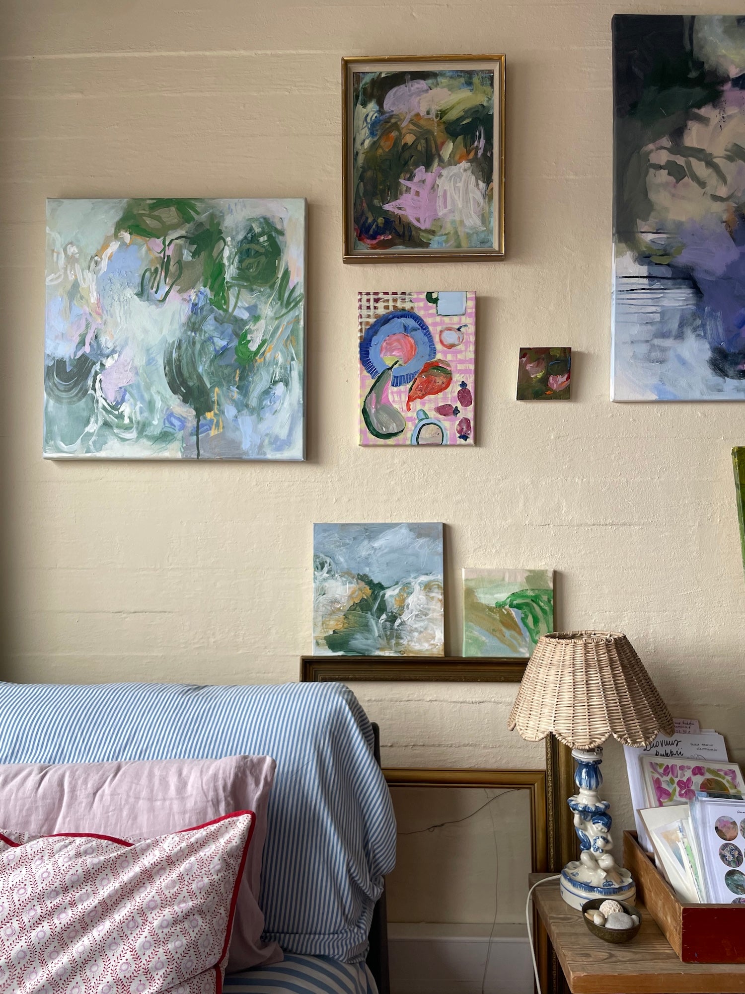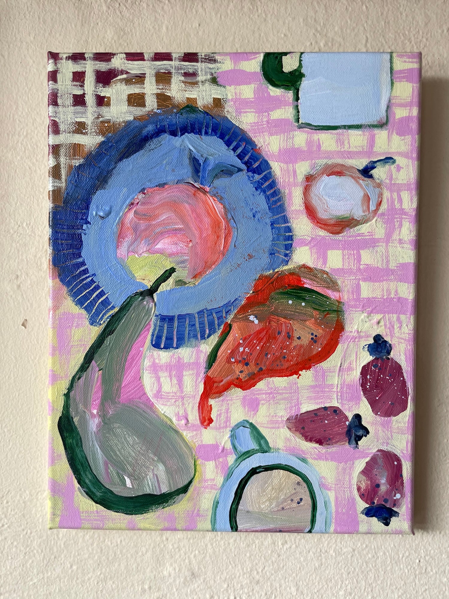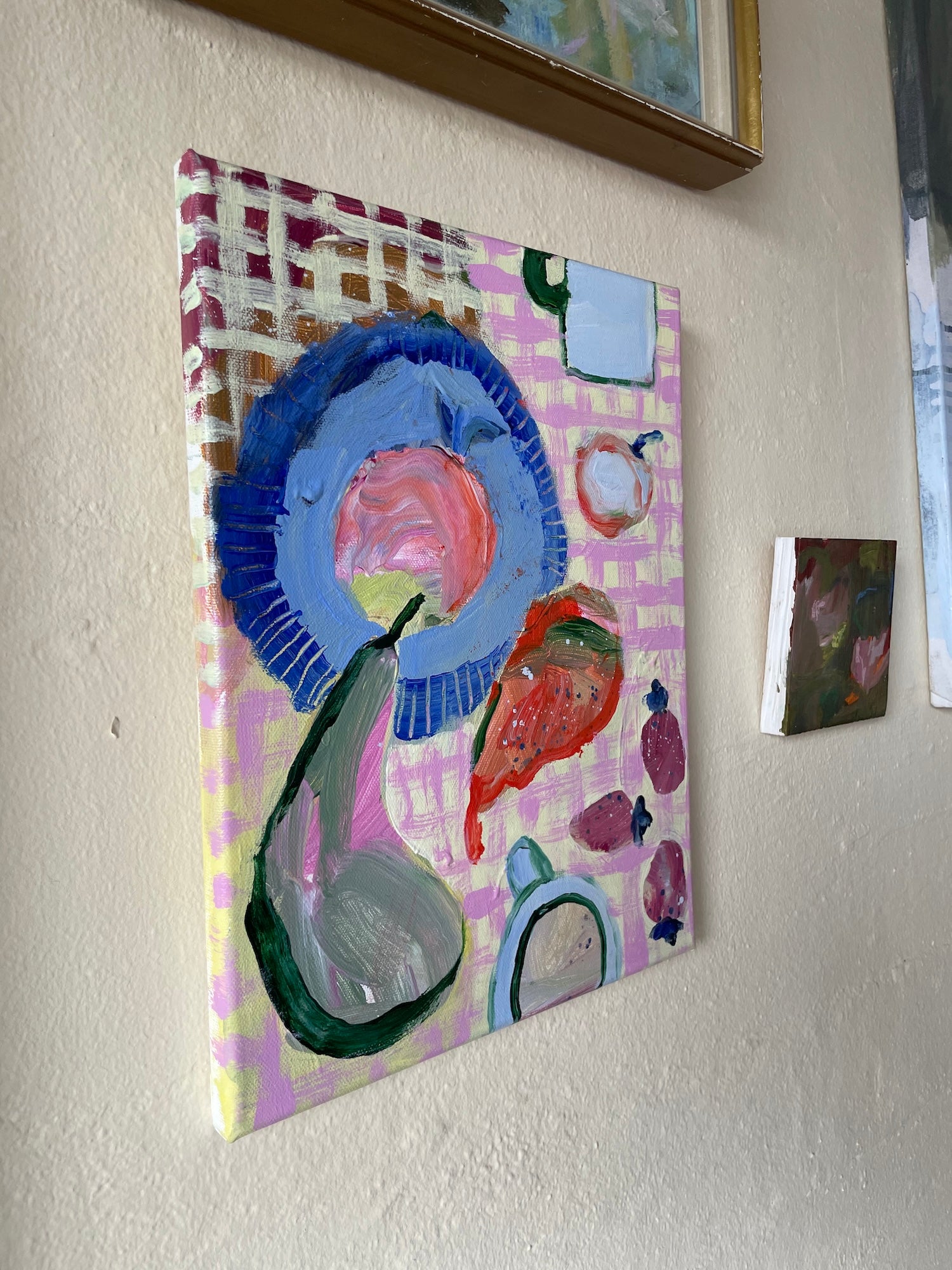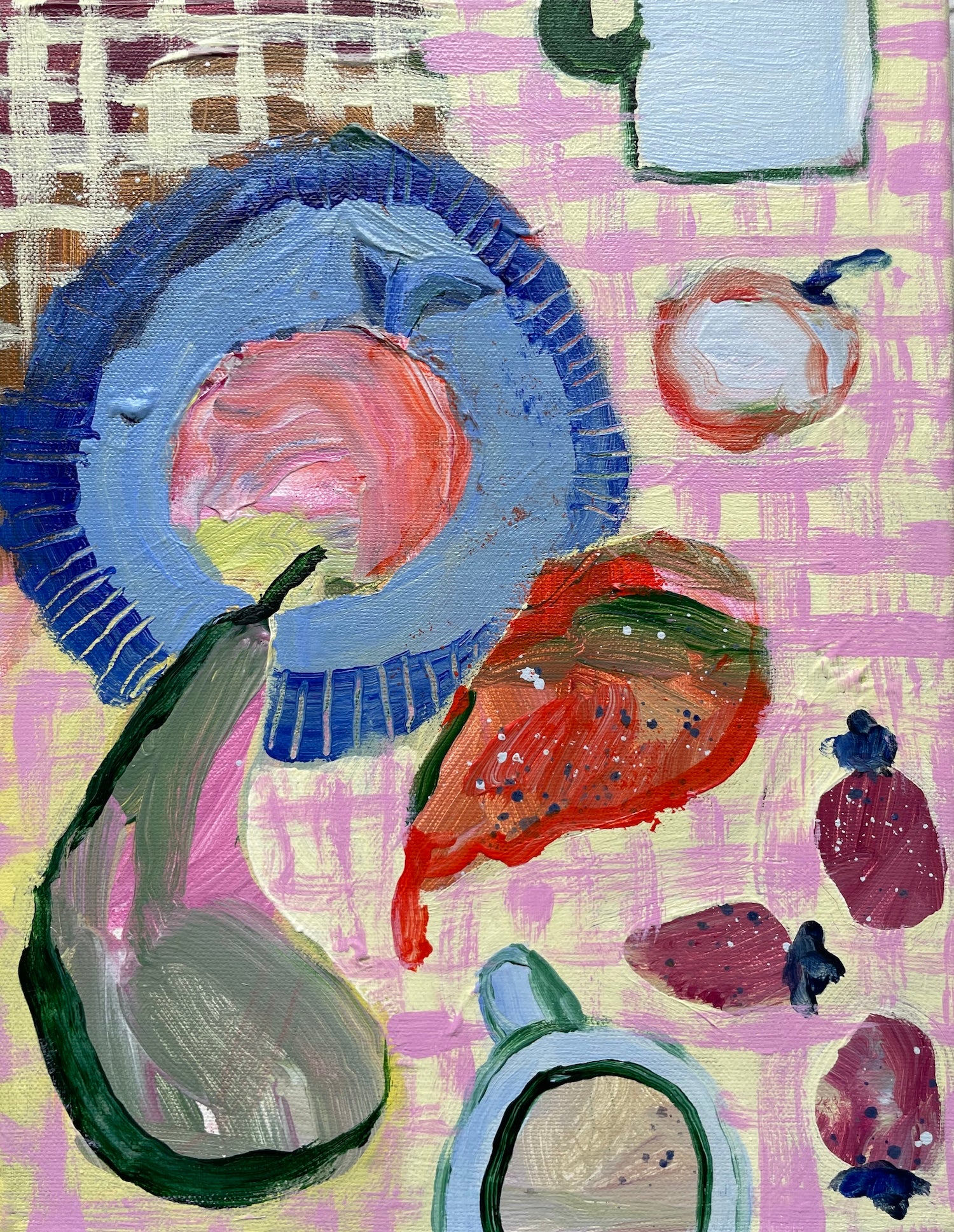 Maalauksen tunnelma on kepeä, kuin lämpimänä kesäaamuna. Pöytään on katettu kahvia ja hedelmiä. Teokseni on oodi tavallisen arjen kauneudelle, pienille tietoisille valinnoille. Elämä tapahtuu arkisissa hetkissä, eikä sitä tarvitse säästellä juhlaan. Kata tänään pöytään se lempiliinasi ja uskalla leikkiä!