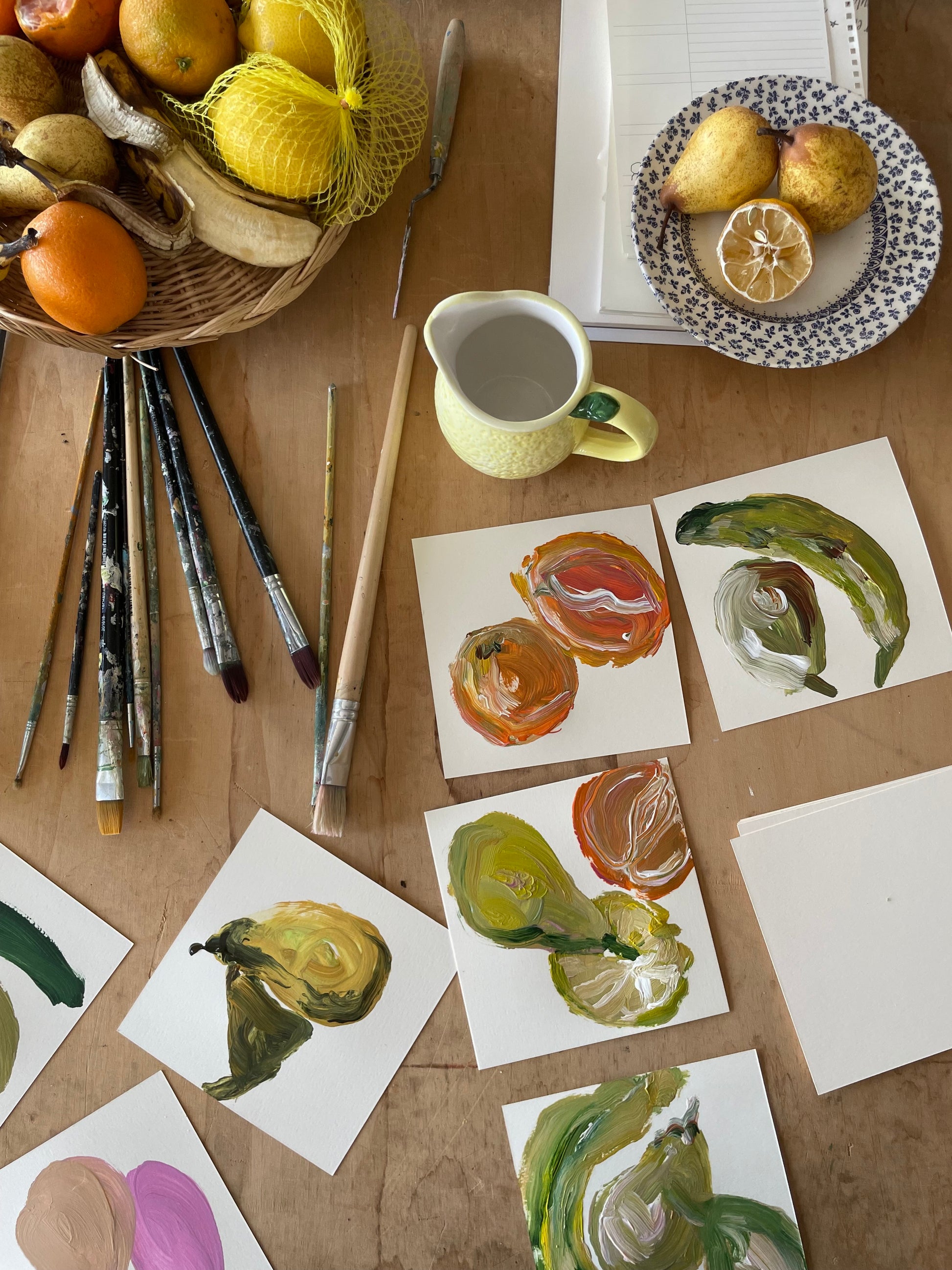 Maalaamme asetelmia sekatekniikalla paperille useamman maalauksen sarjana. Useamman teoksen työstäminen samanaikaisesti vapauttaa ilmaisua ja rohkaisee kokeilemaan erilaisia tyylejä.